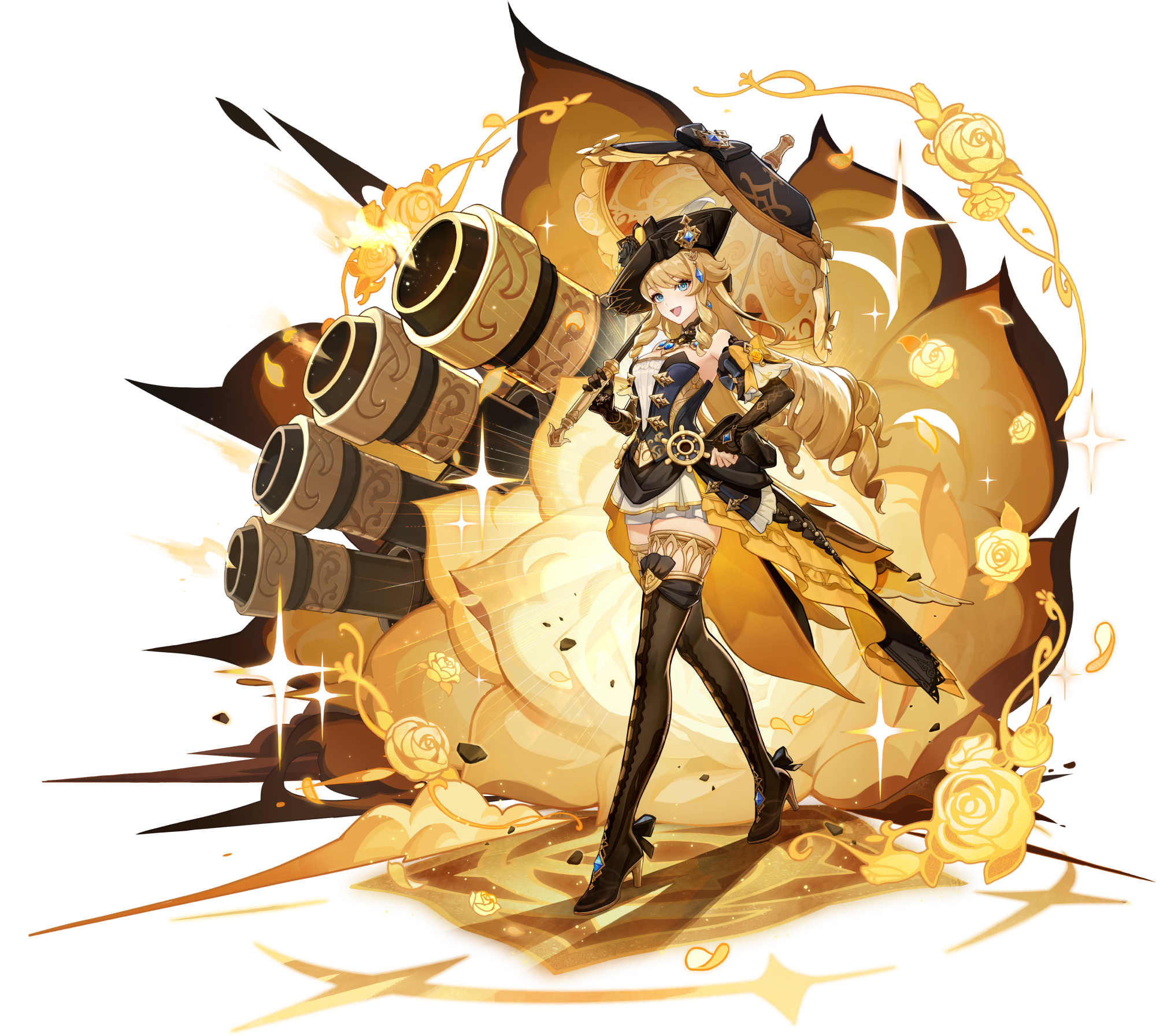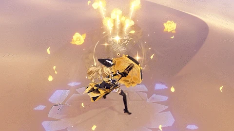 棘薔薇の会の会長命令をもって、華麗なる「金薔薇の礼砲」を召喚し、前方の敵を激しく砲撃して岩元素範囲ダメージを与える。さらにその後、一定時間持続する「火力支援」を行い、一定時間ごとに近くの敵に岩元素ダメージを与える。