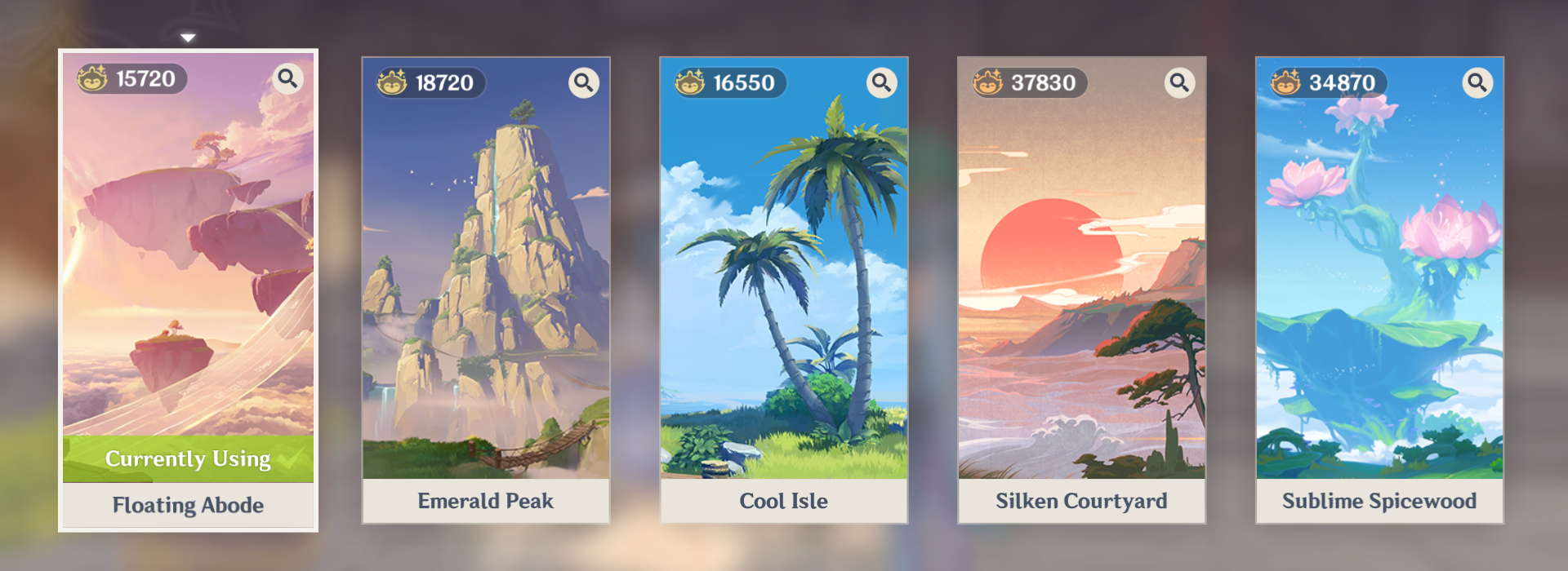 | 絵綺の庭 | 山と水の景色が重なり合う独特な島。空の風には、近隣の茶葉の優雅な香りが漂っている。 | 神櫻の恩恵レベル40から入手 |