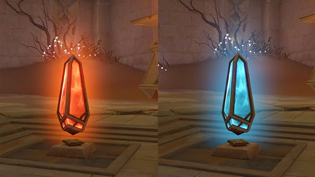 聖顕角柱はキングデシェレト遺跡のコントロール装置であり、不思議な光を放っています。聖顕角柱に近づくと、付近の同じような光を放つオブジェクトを操ったり、その不思議な光の色を変えたりすることができます。