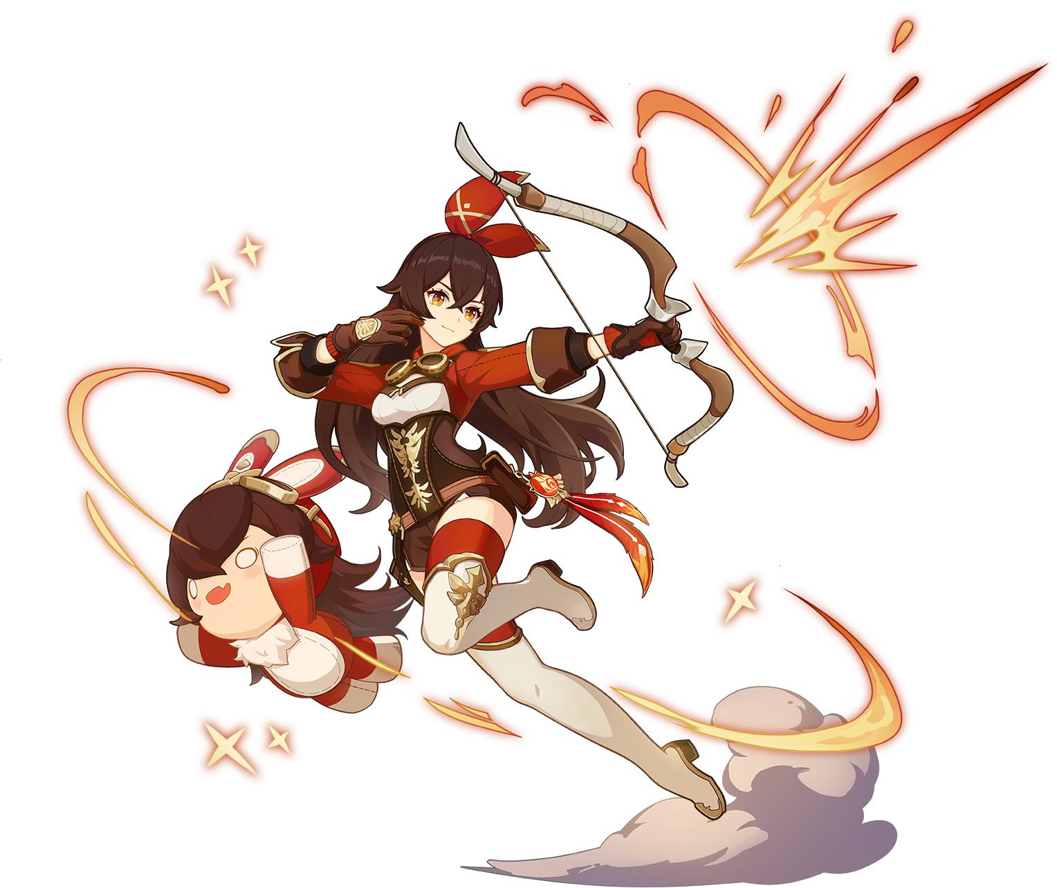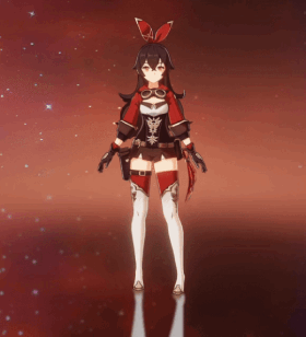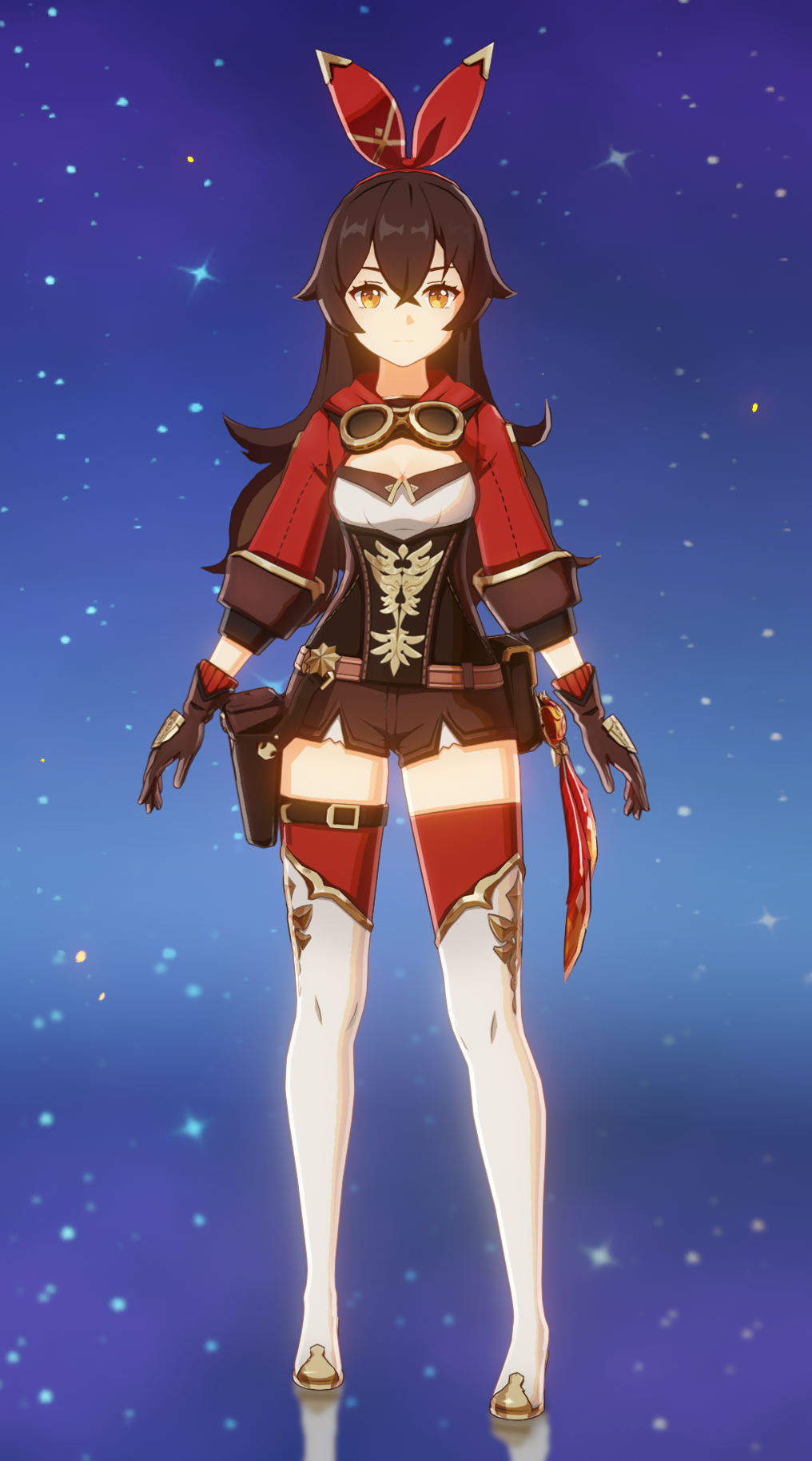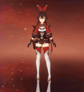 Amber's accessories include a leather belt with two small bags, and her Pyro Vision attached, gloves, a small belt on her right thigh, and gold-framed goggles. Her most distinguishing feature is the headband with the large red bow that rests on her head, resembling the shape of bunny ears. Additionally, her Vision has two red feathers attached below it.