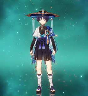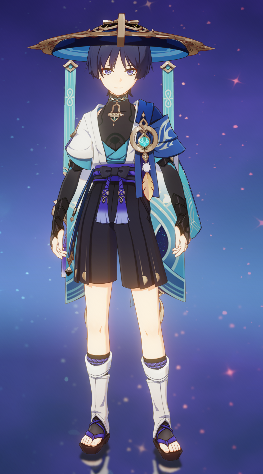 Around his waist, the Wanderer wears black hakama shorts, with a thick black and indigo obi belt, decorated at the front with a large black bow with indigo tassels that dangle off it, their color paling at the ends. The Wanderer sports a pair of knee-high white gaiters, with a black toeless sock knee-high under it, using black geta sandals on his feet, with both legs secured around the top with indigo rope held together with a gold ornament with a singular tassel pinned to it. He wears a patterned blue half-cape with various tones that hangs off his left shoulder, where a large gold ornament containing his Anemo Vision is pinned along with a singular gold feather, which resembles the Plume of Luxury.