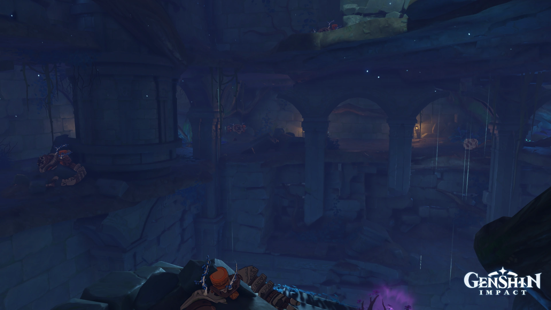 After draining the water in the lake, a maze-like underground ruin is revealed. Inside the first level of the cavern houses another locked mechanism. Descending into the cavern spawns a locked Exquisite Chest and two more Ruin Sentinels. Defeating these Sentinels unlocks the chest and the mechanism. Activating this mechanism drains the water inside and reveals the second level of the cavern, an expansive maze-like ruin. Many dormant Ruin Sentinels and Hydro slimes can be found in the ruins.