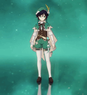 Venti wears a frilly white top with a corset for the midsection, along with green shorts with gold embroidery, a matching green cape held together by a deep blue and gold bow. He also wears white stockings with three gold diamond shapes along each leg and a beret-like hat with a Cecilia, which is his favorite flower. He wears his Anemo Vision on his left hip attached to a belt, with a wing ornament attached to the right of the vision, pom-pom's hang underneath the vision with feathers. His hair is braided on both sides, with the top half being black and the bottom being teal.