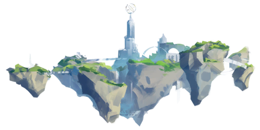 All of these foundation rocks appear almost as if torn from the earth at some point in the past, with their surfaces covered in lush plains and forests contrasting the rough, craggy undersides. While a few signs of architecture are visible on the outer rocks, the main focus lies on the central mass, with two discernible structures made out of marble or similar white stone. The first is a smaller spire-topped structure positioned on the rim of the central mass, while the second is the more prominent central multi-storied spire which itself is topped by a massive golden construct, reminiscent of an astrolabe.