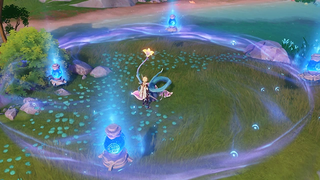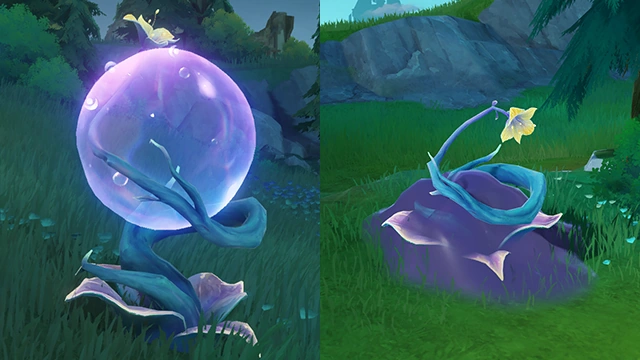 - Popping them with an attack causes ripples that react with Harmonious Reed Pipes or pop other Dew Bubbles.