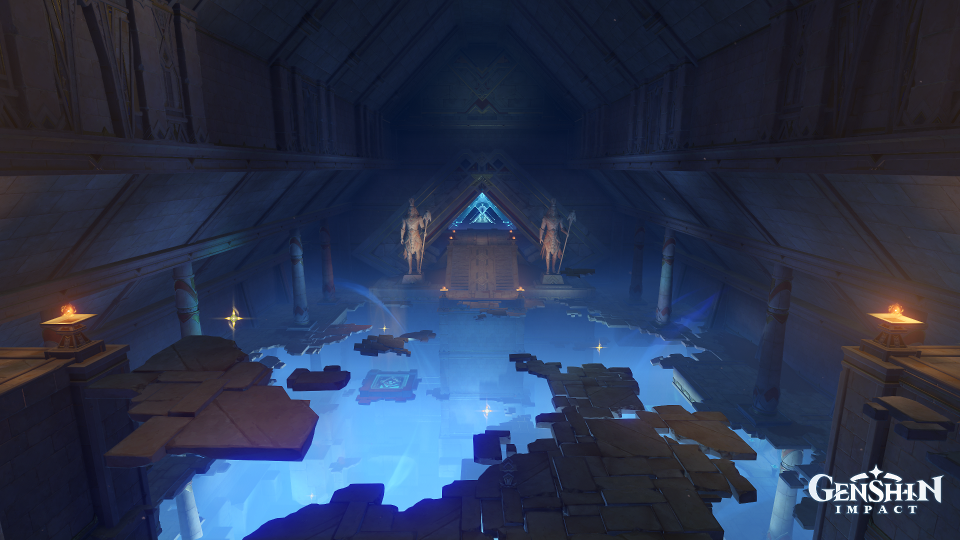 The bottomless hall yawns open like the nether realm itself. The guilty or those who disrespected King Deshret shall meet their destiny here, while those who pass their trials shall fly over the invisible river and continue onward.