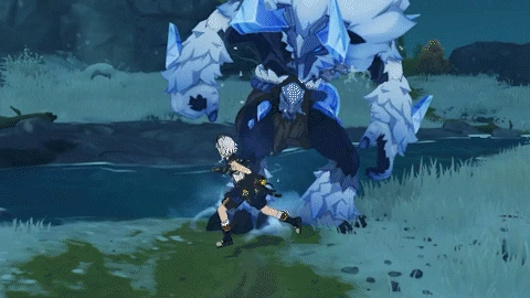 Roars and jumps into the air, slamming down at the player's position, dealing 100% ATK as Physical DMG and freezing the ground around the landing position, which deals 15% ATK as Cryo DoT to characters who step on it. This attack is only performed when the Frostarm Lawachurl is in the Frost Force State.