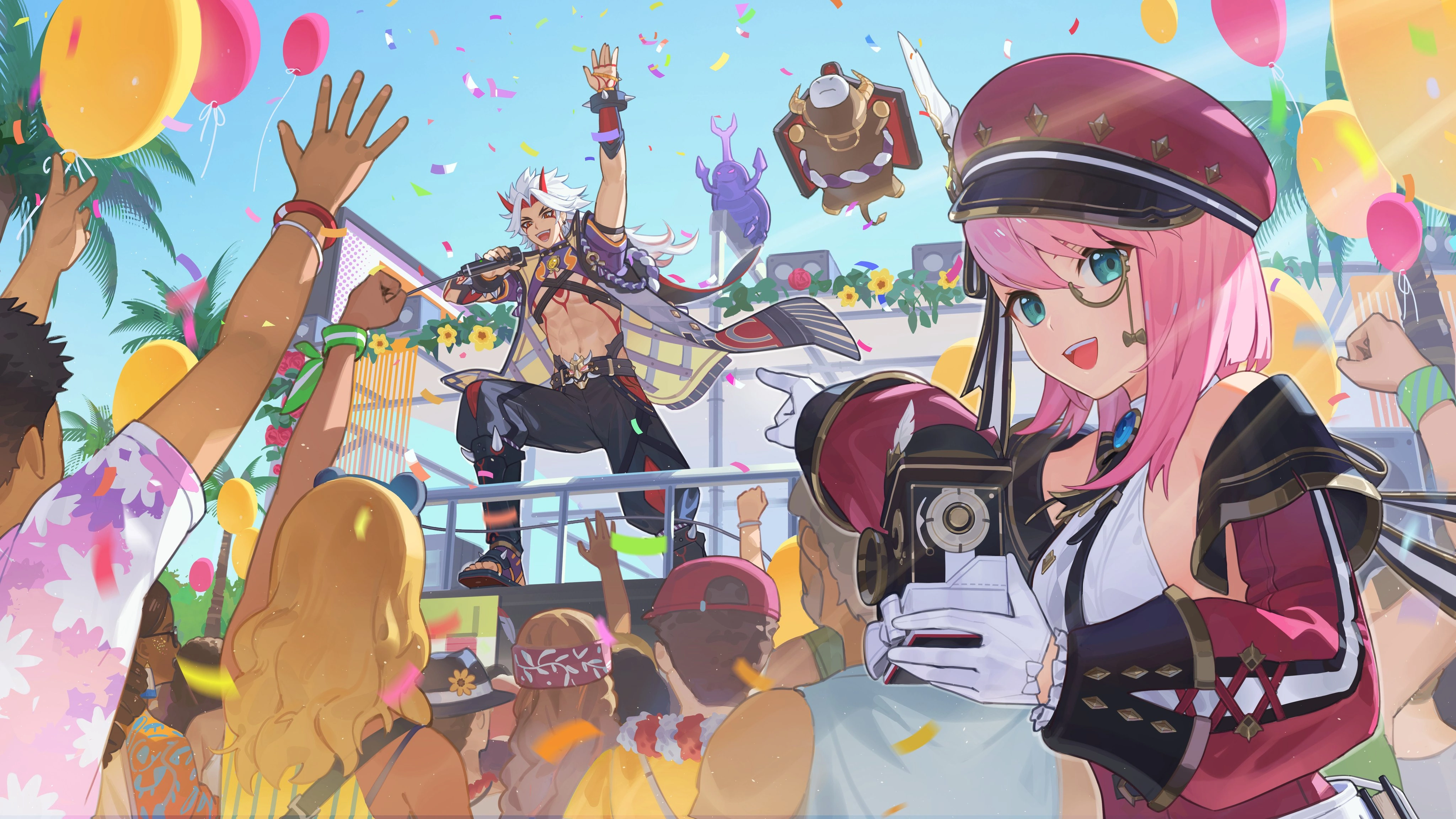 | 青空に飛ぶ風船、風に泳ぐ鯉のぼりがテイワット大陸を彩っています。 柏餅を食べてお祝いしましょう! みんなが元気に過ごせますように! | |