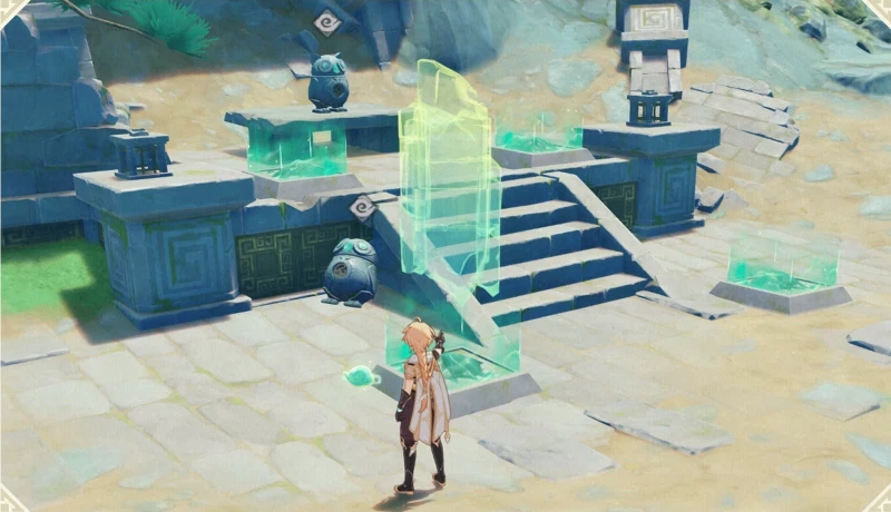 Players will find scattered ruins or simulacra near the areas of interest, which can be picked up and placed in the green pads to cause various effects. When a simulacrum is picked up, they will give hints to the player as to where they should be placed.