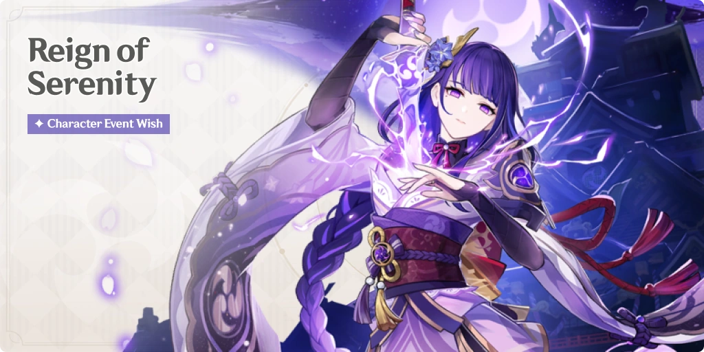 Reign of Serenity is a Character Event Wish with the 5 Star Character "Plane of Euthymia" Raiden Shogun (Electro) as the promoted character with an increased chance to be obtained.