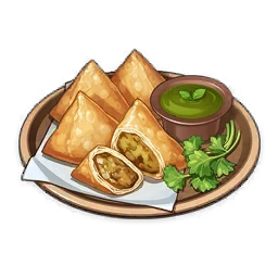 Samosa is a food item that the player can cook. The recipe for Samosa is obtainable from Jahangir for 2,500 Mora.
