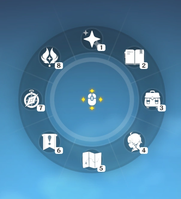 The Shortcut Wheel is an interface that allows the player to quickly access other areas without needing to open the Paimon Menu. The default keybinds are Tab ↹ on PC and
