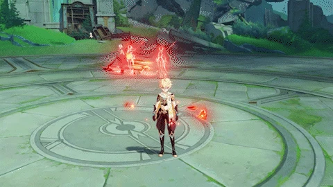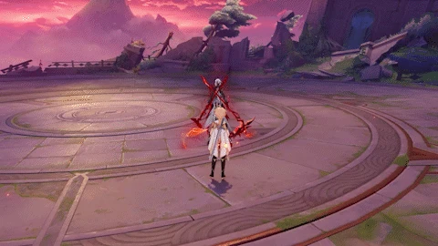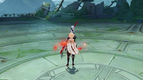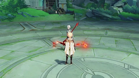 Dashes quickly at the player and slashes once, dealing 70% ATK as Pyro DMG. If below 70% of her Max HP, she may follow up with a hooking pull, dealing 80% ATK as Pyro DMG.