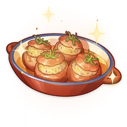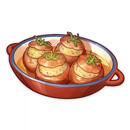 Tomates Narbonnaises is a food item that the player can cook. The recipe for Tomatoes Narbonnaises is obtainable from Sanguinetti at Hotel Debord for 5,000 Mora.