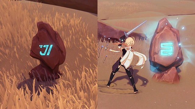 Weathered Obelisks come in paired sets, one set glows and can be altered by the player's characters attacking the obelisk. Manipulating these glowing symbols to match the unchangeable symbols on the other obelisk exactly will grant a Chest.
