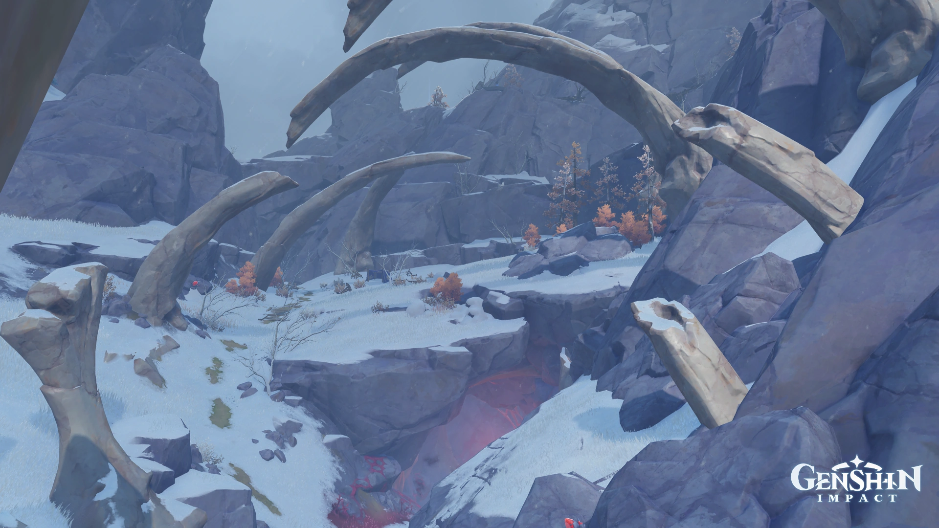 The final resting place of the black dragon. The life force exuding from the dragon's core has dyed the steep valley's silvery snow in scarlet red.